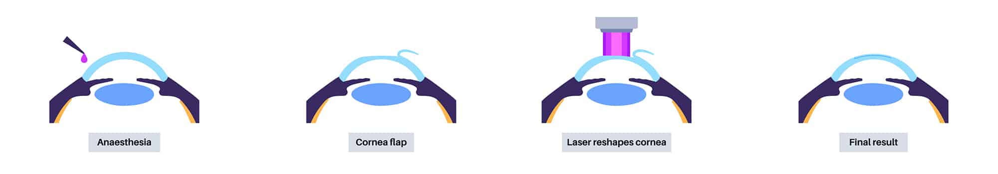In this procedure, the surface layer of corneal tissue is folded back from its usual position. The laser then gently reshapes the corneal surface and the surface layer is placed back in its original position where it bonds naturally.